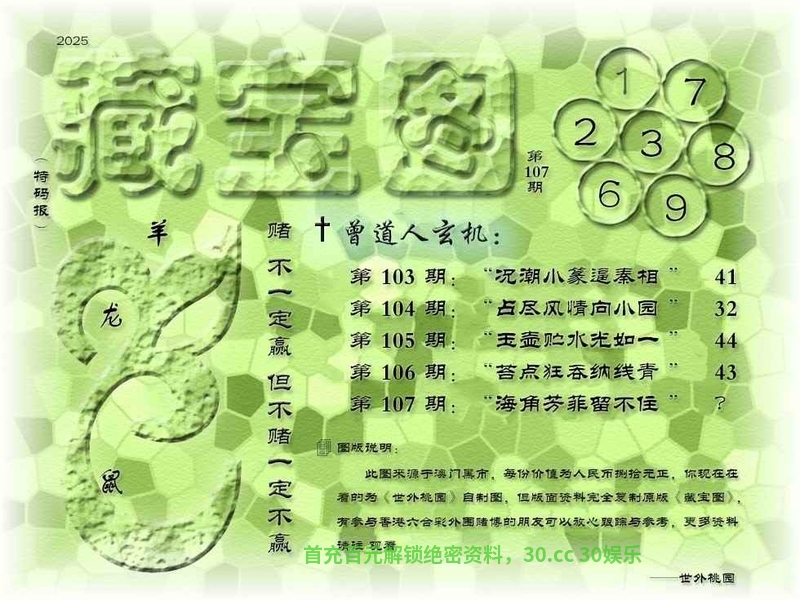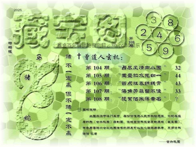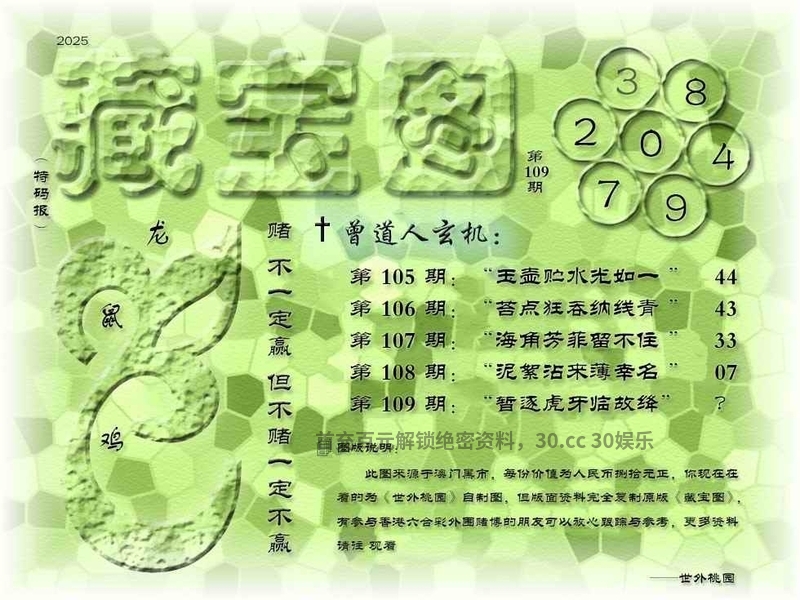 110期藏寶圖新:合处畴能证不疑 老:松间沙路净无泥 禁:龙 禁:4尾 玄機字:《夙》